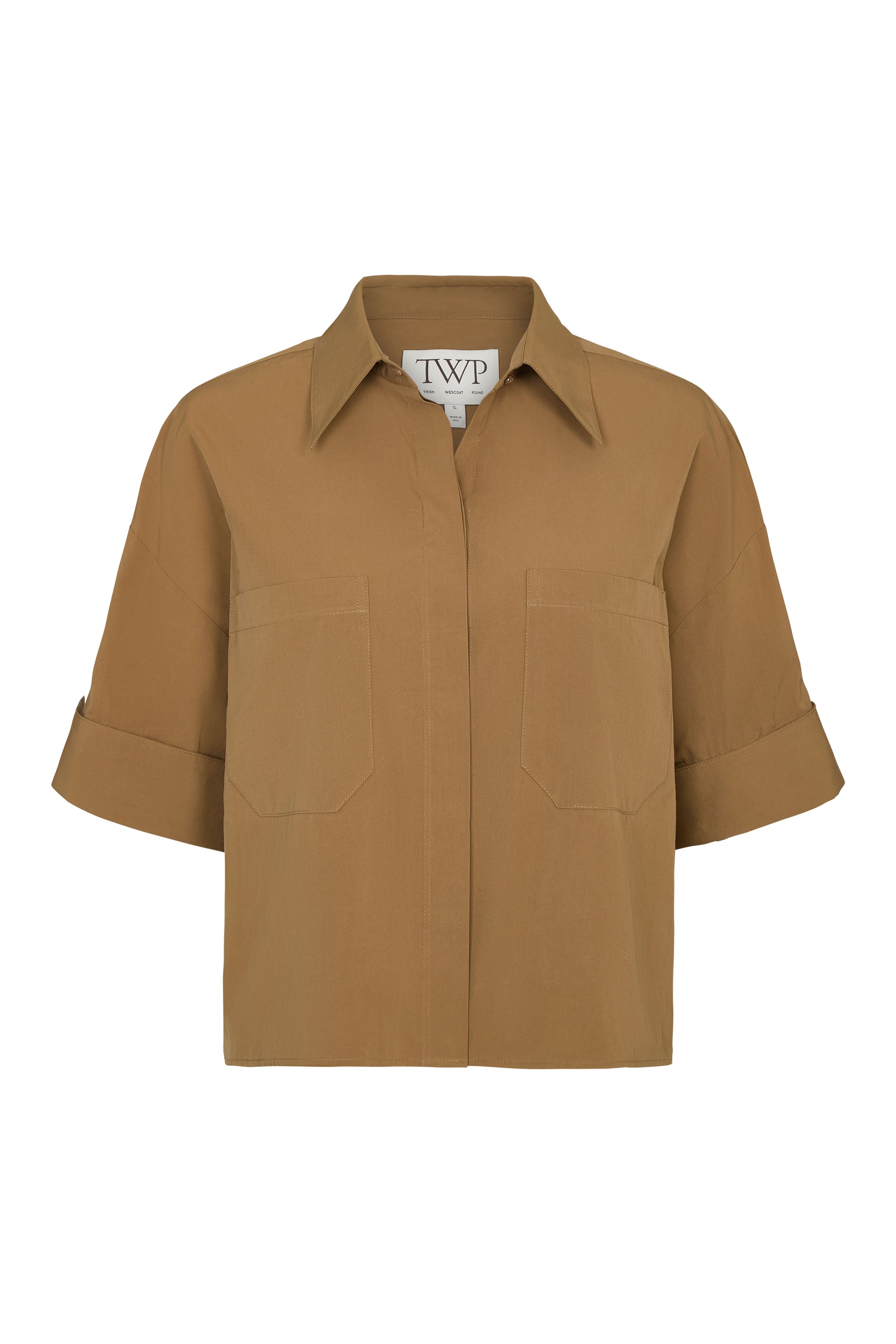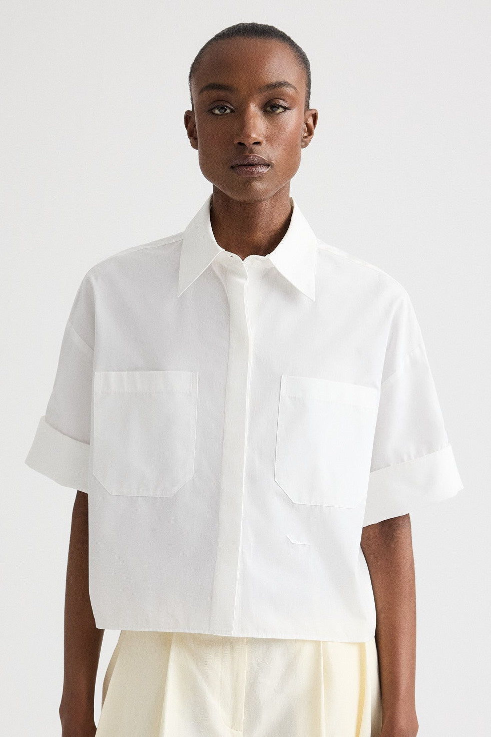 Short-sleeve button-up in superfine Italian cotton shirting. The My Newest Mistake Shirt is designed with a relaxed, boxy fit, dropped shoulders, and cuffed short sleeves. Finished with a point collar, chest patch pocket, and clean hem.