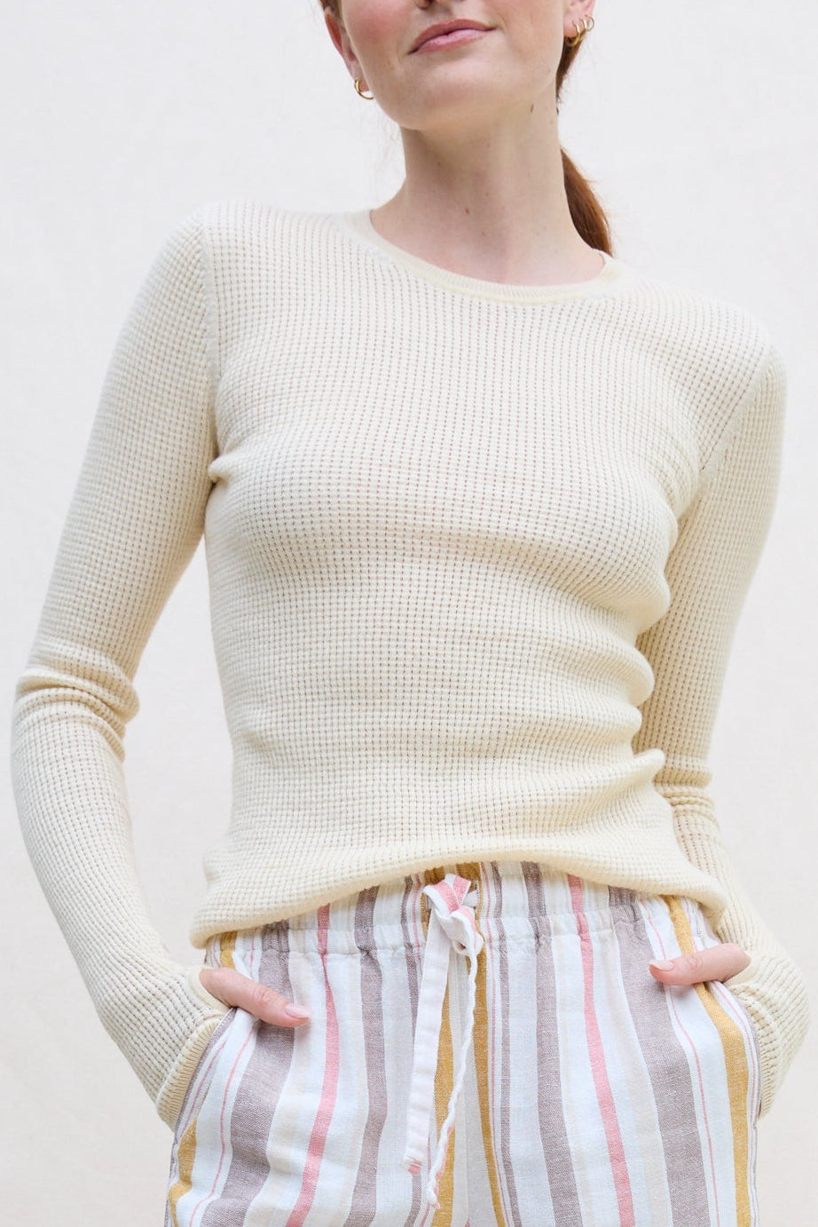 This ribbed waffle knit crewneck is a wardrobe staple perfect for layering. It features thumbholes, and a reinforced curved hem that is made to last.