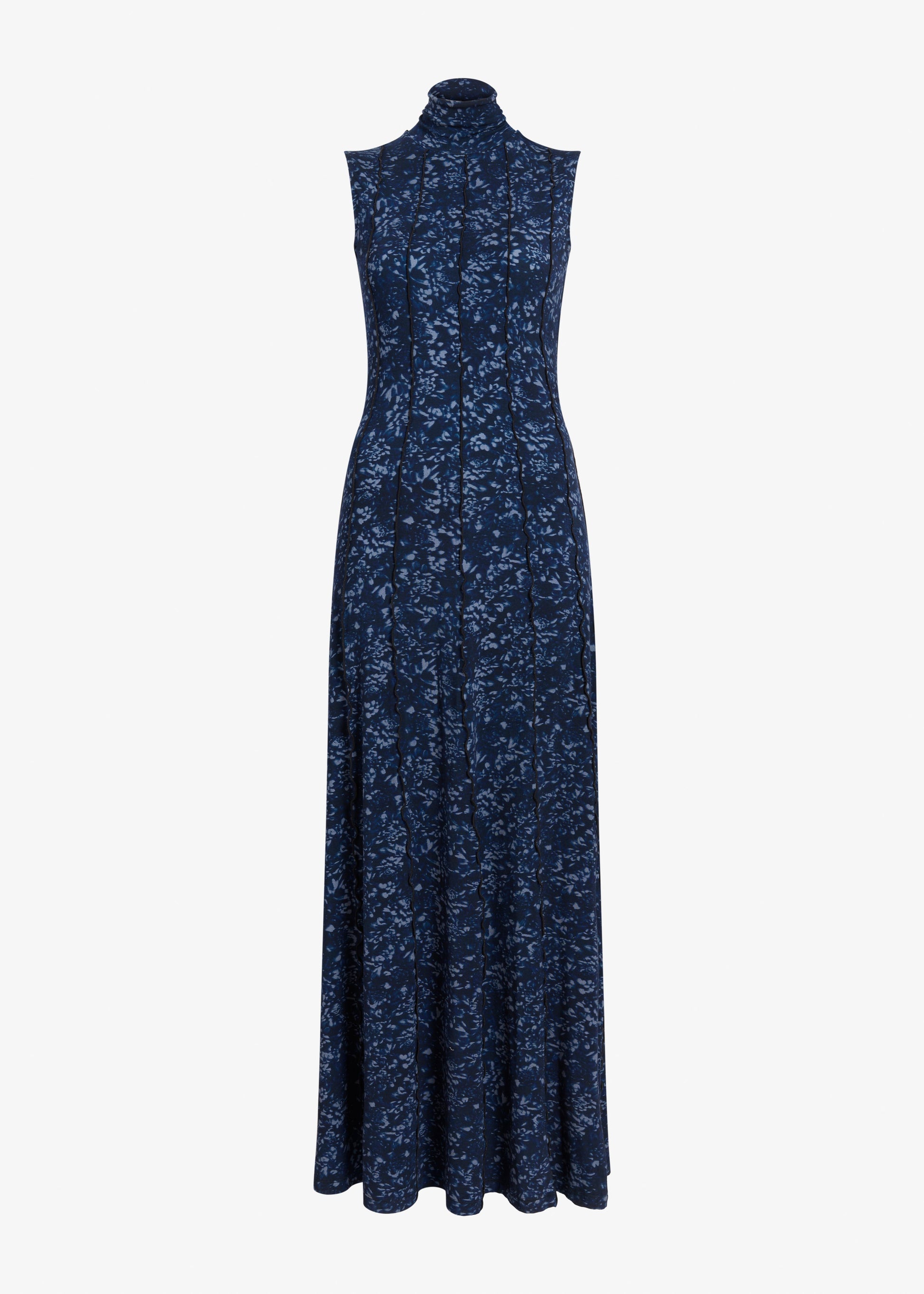 The Valentina Dress in Printed Jersey is crafted in a soft jersey fabrication to a sleeveless turtleneck silhouette with a full sweep.